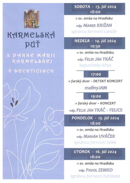 O 10:30 sa pri kaplnka Panny Márie Karmelskej na Hradišti uskutoční svätá omša, ktorú bude celebrovať kapucínsky kňaz vdp. Felix Ján Tkáč.